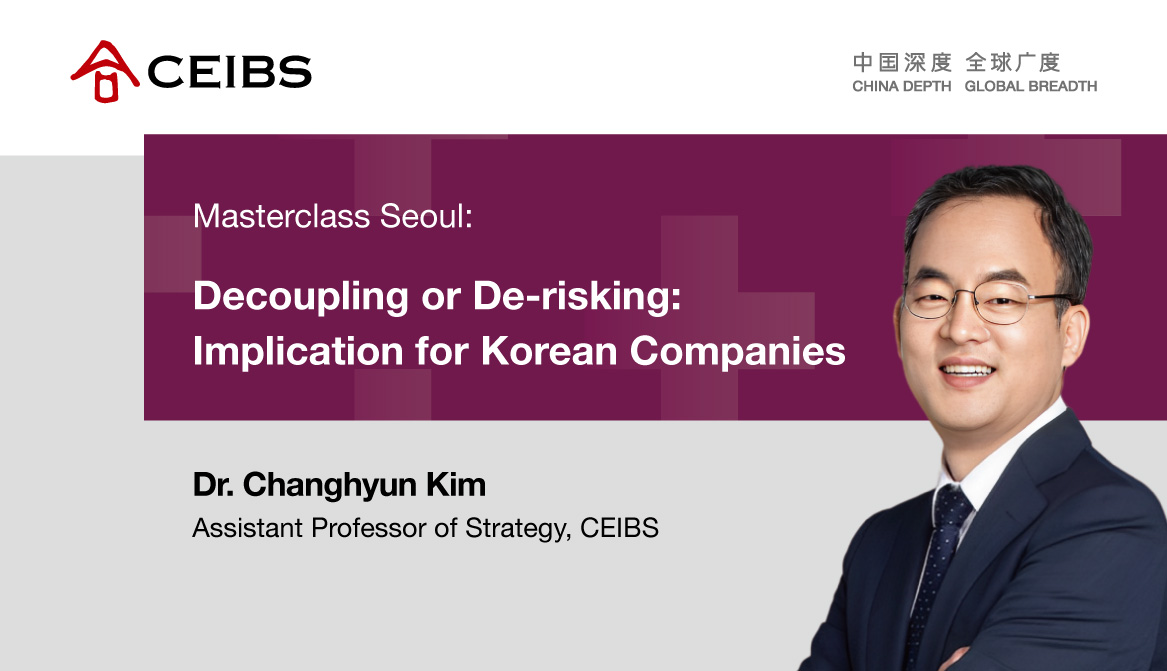 Join us on August 25, 2023, for a special Masterclass Seoul with CEIBS Assistant Professor of Strategy Changhyun Kim on the topic of Decoupling or De-risking: Implication for Korean Companies.
