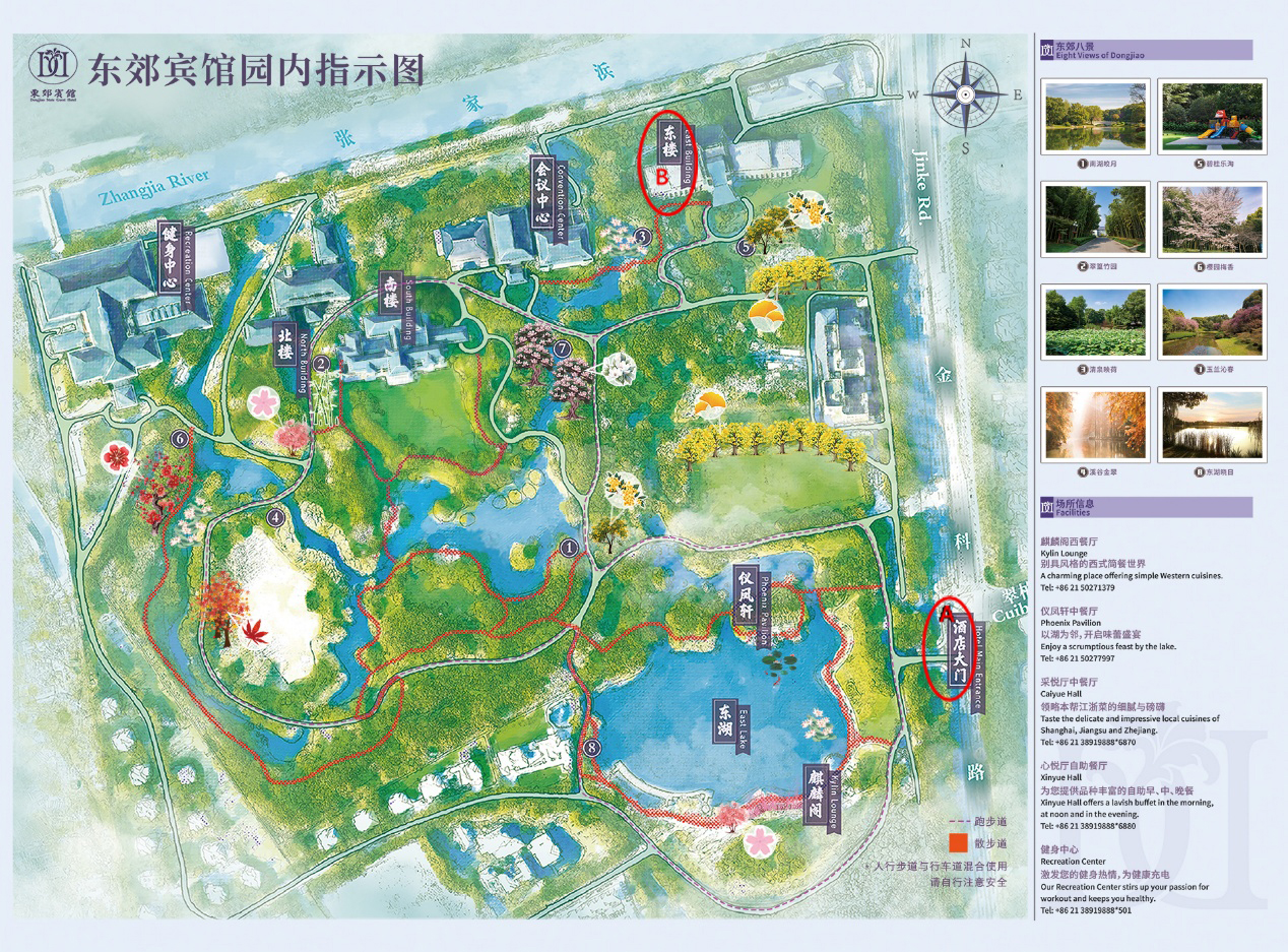 Please note that hotel rooms for guest speakers are at Dongjiao State Guest Hotel East Building (Point B on the hotel map), around 10-minute-walk from hotel gate (No. 1800 Jinke Road) (Point A on the hotel map). Please take taxi directly to East building.