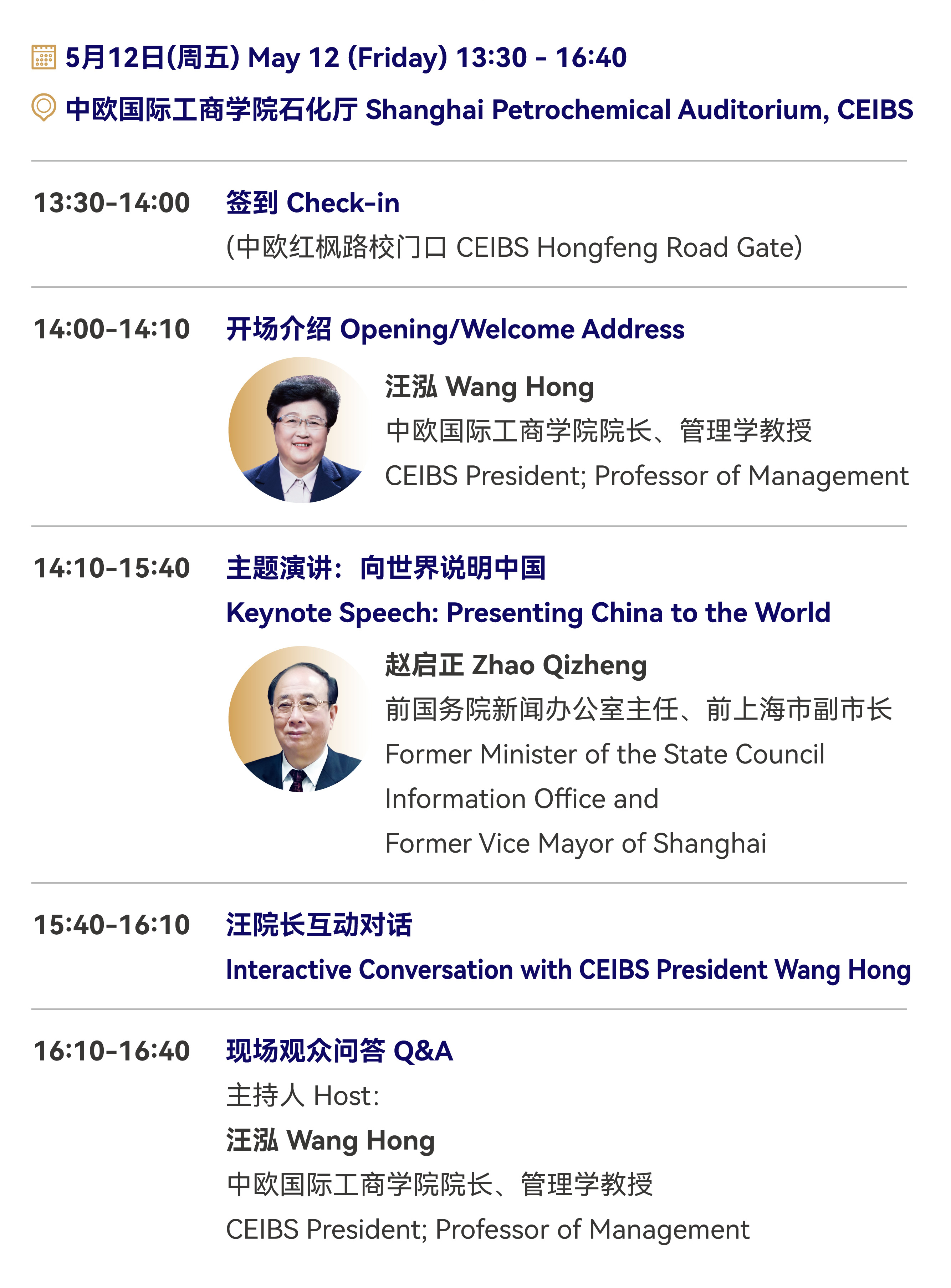 In celebration of CEIBS’ 30th anniversary in 2024, we will host the CEIBS OUTLOOK SERIES of events, which will bring together tops minds in management, humanities and sciences from China and the world. The first session will take place on May 12, and we are honoured to invite Zhao Qizheng, Former Minister of the State Council Information Office and Former Vice Mayor of Shanghai and CEIBS President Wang Hong to explore the theme of “Presenting China to the World” and share their unique perspectives on “China's stance and international expression.”