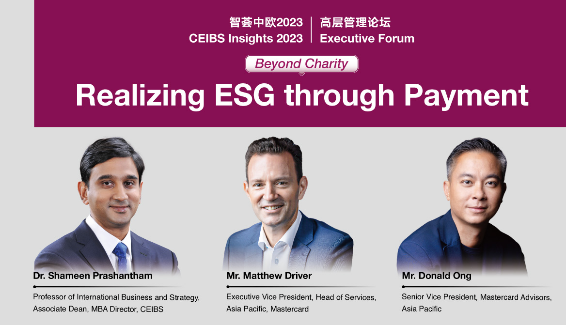 Please join us for our upcoming CEIBS Executive Forum on May 22, 2023, with Mr. Matthew Driver, Executive Vice President, Head of Services, Asia Pacific, Mastercard, and Mr. Donald Ong, Senior Vice President, Mastercard Advisors, Asia Pacific, who discuss Realizing ESG through Payment – The Most Common Business Activity.