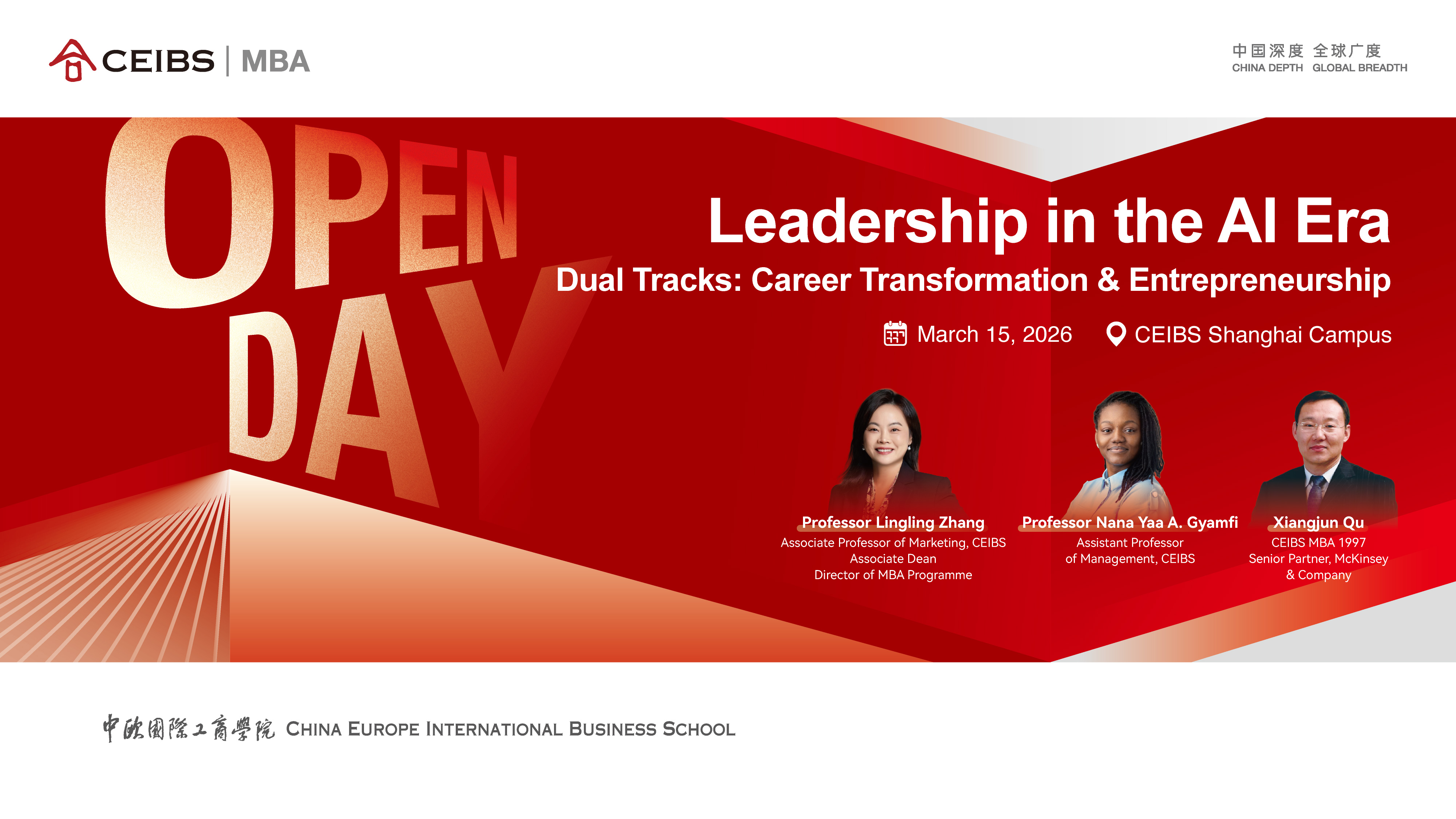 This CEIBS MBA Open Day focuses on Leadership in the AI Era. Drawing on global business practice and cutting-edge academic insight, the event explores how leaders can understand AI, navigate change, and translate technology into sustainable leadership capability and personal growth momentum. Two parallel tracks are offered: Career Transformation and Innovation & Entrepreneurship — one supporting career transformation and advancement, the other linking innovation practice with business and family enterprise succession, addressing the real choices faced at different stages of life and career.