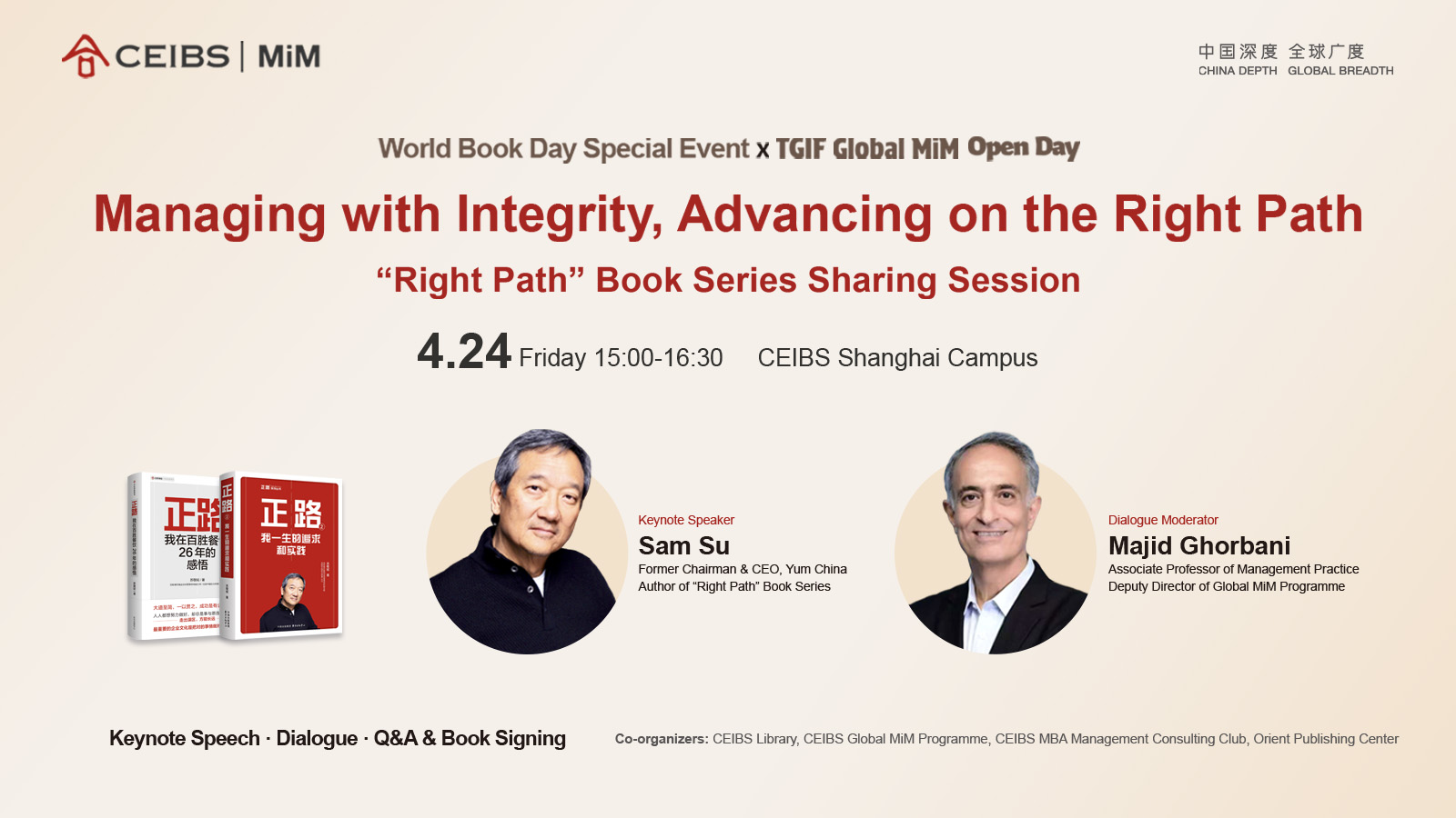 As World Book Day approaches, CEIBS will host a sharing session on the theme "Managing with Integrity, Advancing on the Right Path" on Friday, 24 April from 15:00 to 16:30.