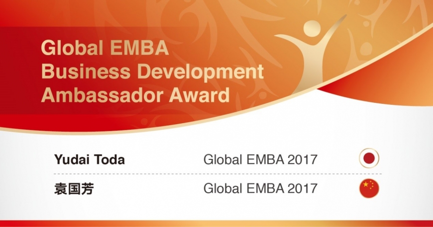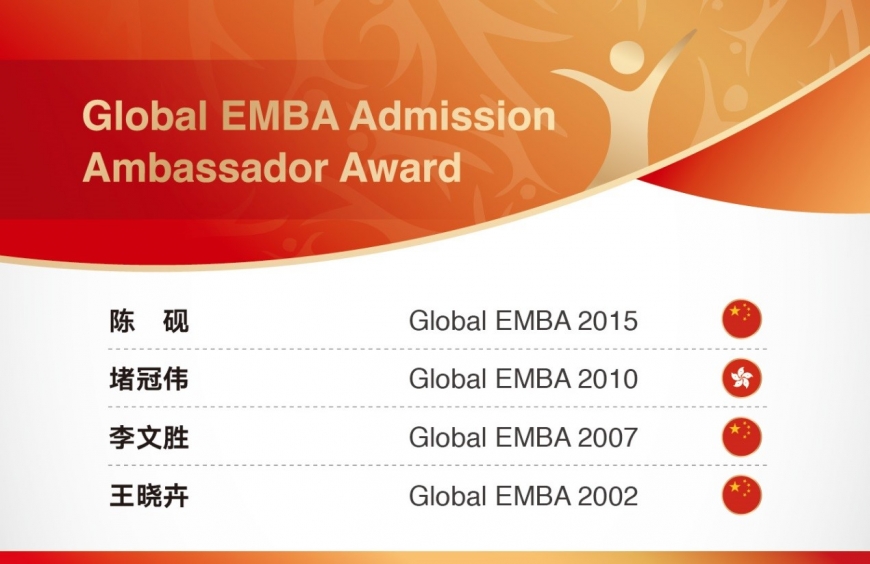 The Global EMBA Business Development Ambassador Award is awarded in thanks to alumni who are enthusiastic about assisting the future development of the programme. In addition to actively recommending new participants for the Global EMBA, they also help share their learning experience with other applicants.