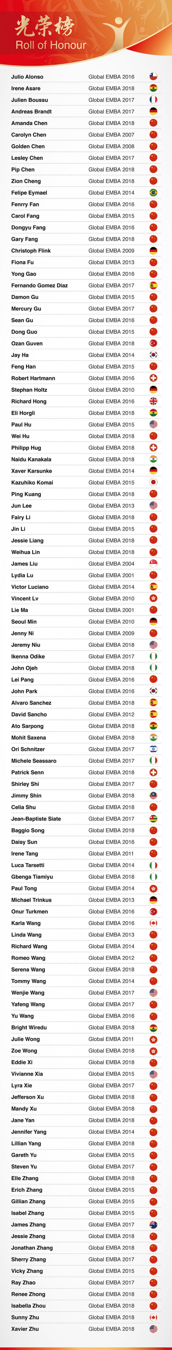 In November 2019, during the CEIBS 25th Anniversary Celebration Gala, 10 alumni won the honorary title of CEIBS Outstanding Alumni Representatives, 3 of whom Global EMBA alumni. These alumni are active in the CEIBS community and contribute a lot to the development of CEIBS.