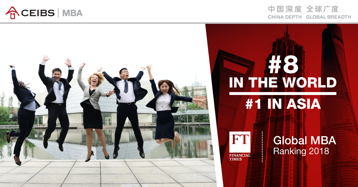 January 29, 2018. Shanghai – The CEIBS MBA has moved up 3 spots to #8 in the Financial Times ranking of the world’s top 100 full-time MBA programmes, making its way back into the top 10 and cementing its position as #1 in Asia. The 2018 ranking was released by the FT today. The top10 are: Stanford, INSEAD, Wharton, LBS, Harvard, Chicago Booth, Columbia, CEIBS, MIT Sloan and Berkeley. The annual assessment of MBA programmes is considered, within business school circles, as the most authoritative ranking.