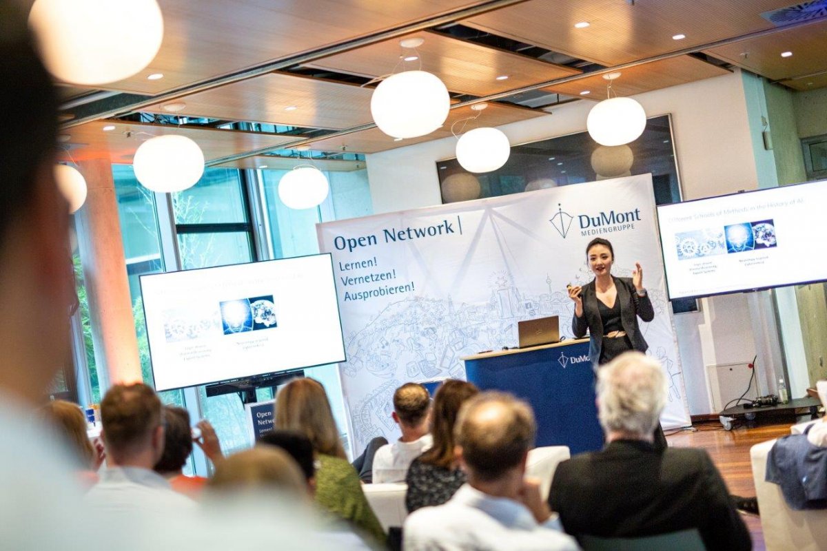 July 11, 2019. Cologne – Nearly 130 attendees gathered at the Neven DuMont Haus in Cologne, Germany, this evening for a special talk by CEIBS Lecturer of Strategy Guo Bai on Transformative Forces of AI. Among other things, Dr. Bai’s lecture discussed the nature of the hype surrounding artificial intelligence and whether it can make a meaningful and positive contribution to the global economy. Citing previous work in the field, Dr. Bai began by explaining to participants why AI and IT technologies have not yet played a strong role in enhancing the productivity of our economy – at least according to productivity statistics.