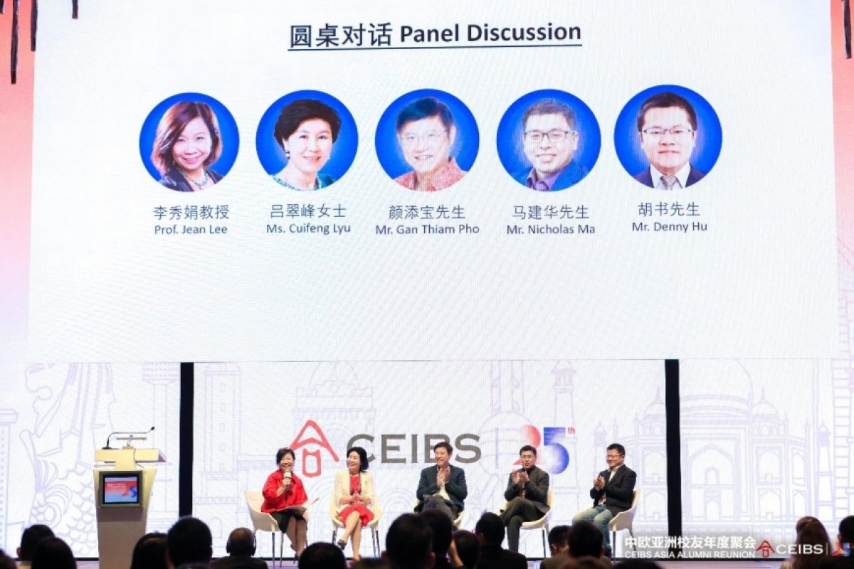 Following Prof. Jain’s keynote address, a panel discussion was moderated by CEIBS Professor of Management Jean Lee. MP of Singapore Mr. Gan Thiam Poh; Mr. Nicholas Ma, CEO of Huawei International; Ms. Cuifeng Lyu (CEIBS EMBA 2008), President of Shanghai Smart Cargo Supply Chain Management Co., Ltd.; and Mr. Denny Hu (CEIBS EMBA 2015), Senior Finance Manager of Xiaomi India, discussed how Asian companies could stand out in a complicated and ever-changing competitive global landscape.