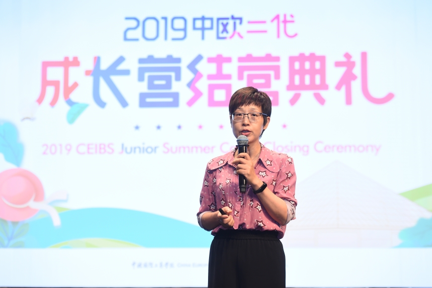 CEIBS Union Chairwoman Ms. Xu Huijuan speaks during the 2019 CEIBS Junior Summer Camp Closing Ceremony