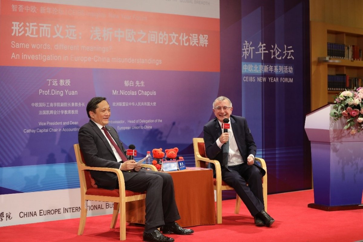 December 12, 2020. Beijing – The CEIBS Beijing New Year’s Forum was held today at the National Centre for the Performing Arts. EU Ambassador to China Nicolas Chapuis was invited to deliver a keynote speech entitled, “The Form is Close, but the Meaning is Far – An Analysis of Cultural Misunderstandings between China and Europe”. CEIBS President Wang Hong also attended the forum and delivered the opening speech. The event also featured a dialogue between CEIBS Vice President and Dean Ding Yuan and Ambassador Chapuis about how to bridge differences and promote mutual trust and cooperation between China and Europe.