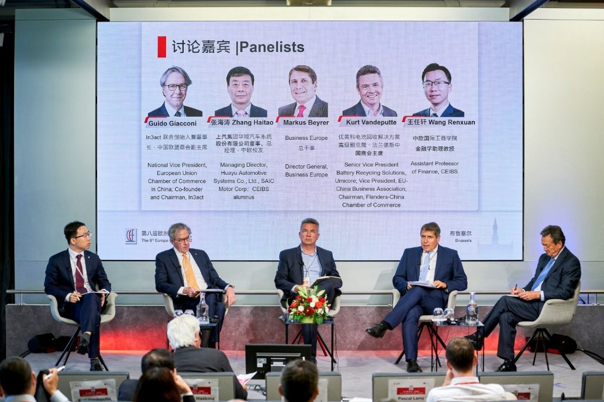 BusinessEurope Director General Markus Beyrer; Umicore Senior Vice President Battery Recycling Solutions, EU-China Business Association Vice President and Flanders-China Chamber of Commerce Chairman Kurt Vandeputte; Huayu Automotive Systems President Zhang Haitao; and CEIBS Assistant Professor of Finance Wang Renxuan were then joined by former Ambassador of Belgium to China and Mongolia Patrick Nijs for a panel discussion in which they highlighted the need for greater China-EU cooperation on climate, the importance of decarbonization as a form of corporate social responsibility and the role of cross-border finance in driving China’s dual carbon goals.
