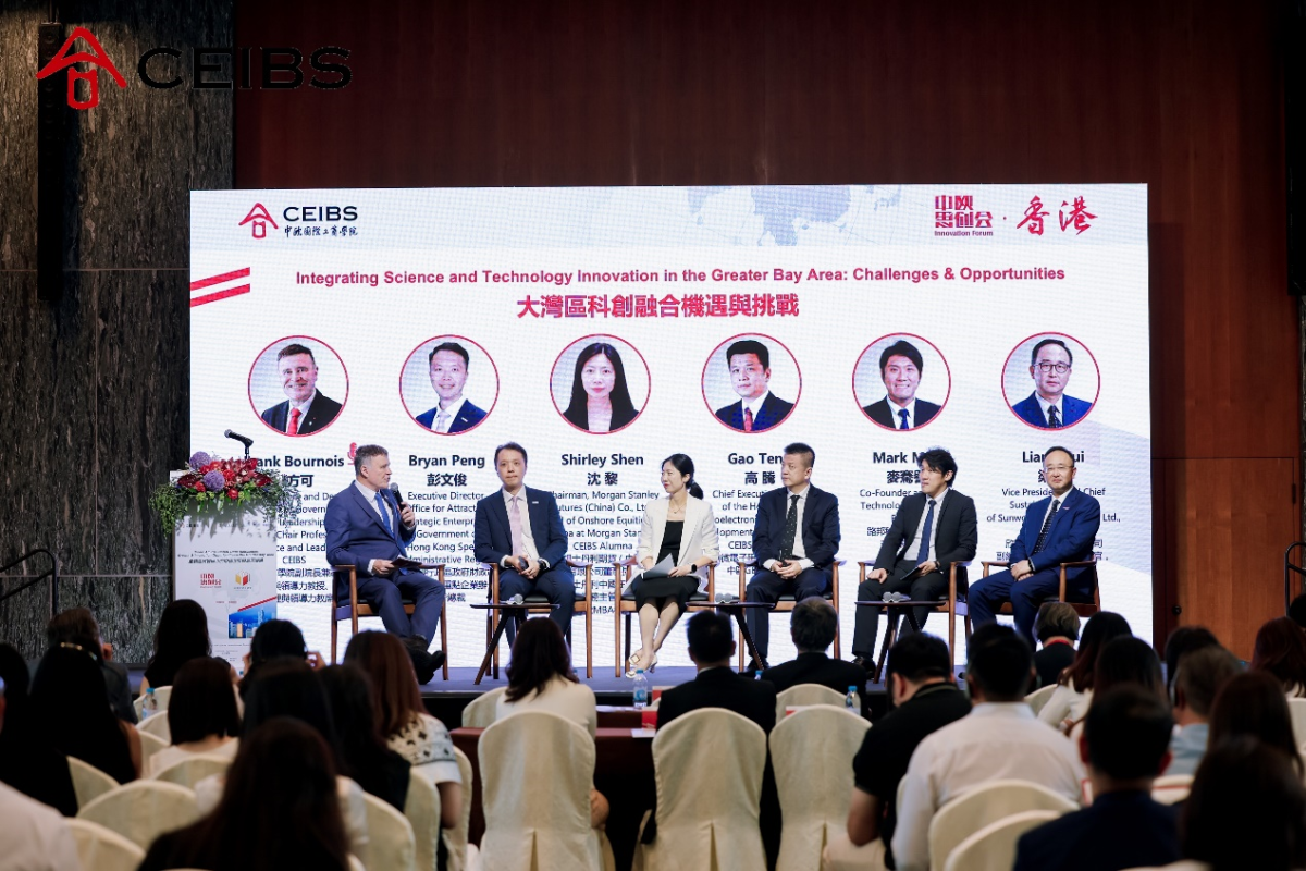 The event then proceeded to a panel discussion centred on the theme “Integrating Science and Technology Innovation in the Greater Bay Area: Challenges & Opportunities”, moderated by Prof. Frank Bournois. An enlightening and insightful exchange of ideas, the panel hosted: Bryan Peng, Executive Director of the Office for Attracting Strategic Enterprises of The Government of the Hong Kong Special Administrative Region; Shirley Shen, Chairman of Morgan Stanley Futures (China) Co., Ltd., Head of Onshore Equities for China of Morgan Stanley, and CEIBS alumna; Gao Teng, Chief Executive Officer of the Hong Kong Microelectronics Research and Development Institute (MRDI) and CEIBS alumnus; Mark Mak, Co-Founder and Chief Technology Officer of Roborn; and Liang Rui, Vice President and Chief Sustainability Officer of Sunwoda Electronic Co., Ltd. and CEIBS alumnus.