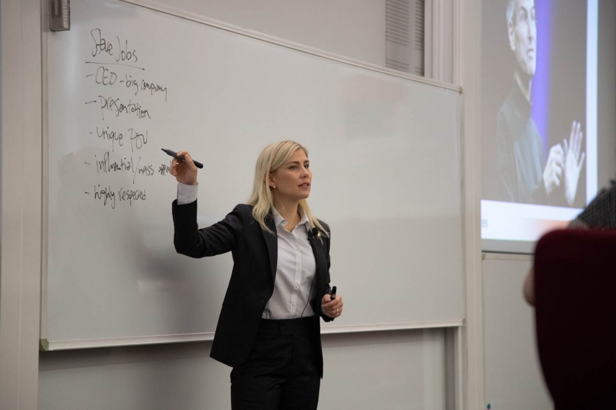 Assistant Professor of Management Emily David led students to explore the relationship between body language, verbal communication, power, and leadership. To become future business leader, young professionals must be aware of and understand the inherit relationships between such mediums, she explained. In her case discussion, Professor David demonstrated how the same words presented with different levels of confidence can be perceived very differently. “People are always worried about what they’re going to say or how they’re going to say it, but they don’t think enough about their body language when they’re going to say it,” she said.