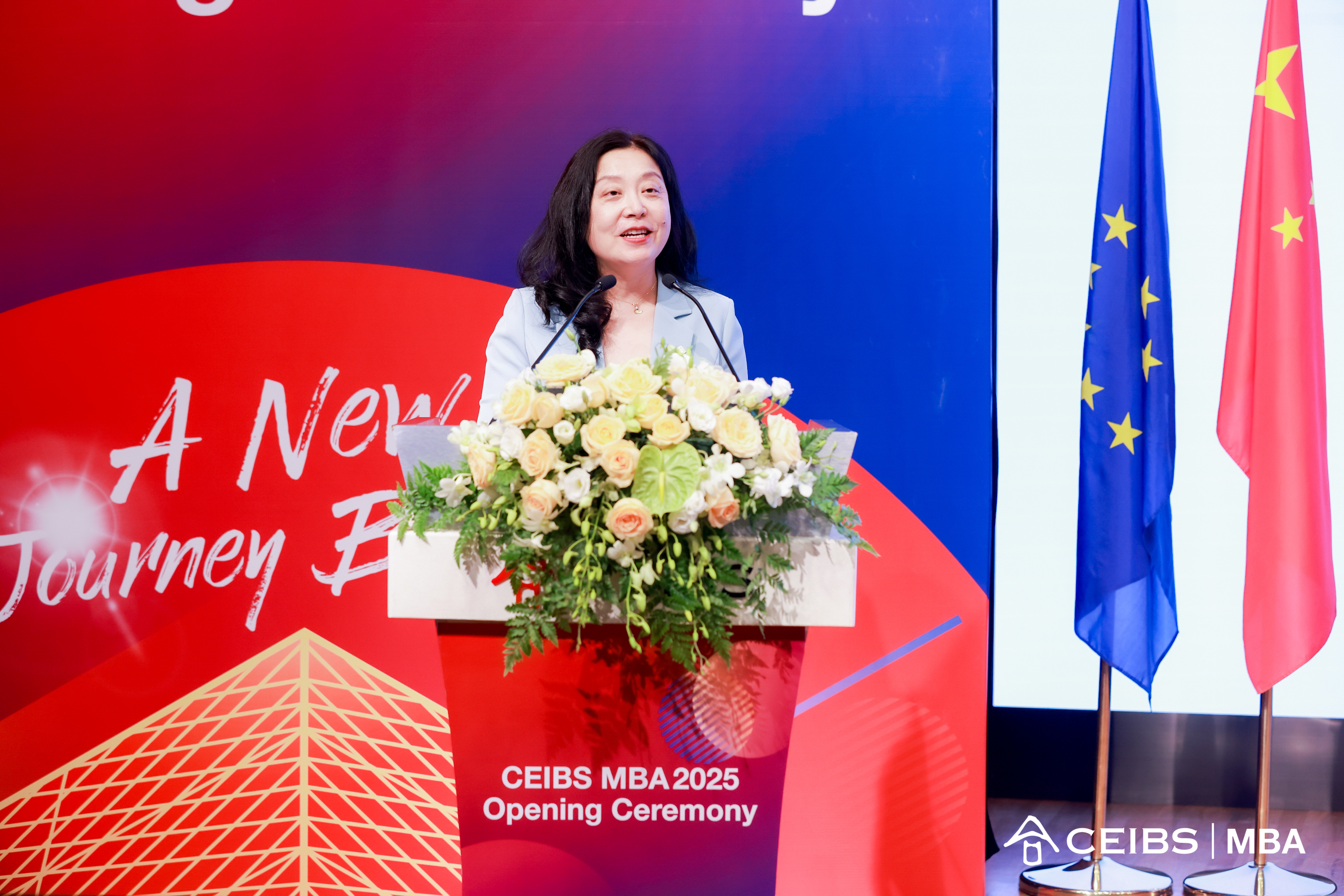 CEIBS President Wang Hong offers her opening remarks during the MBA Class of 2025 Opening Ceremony